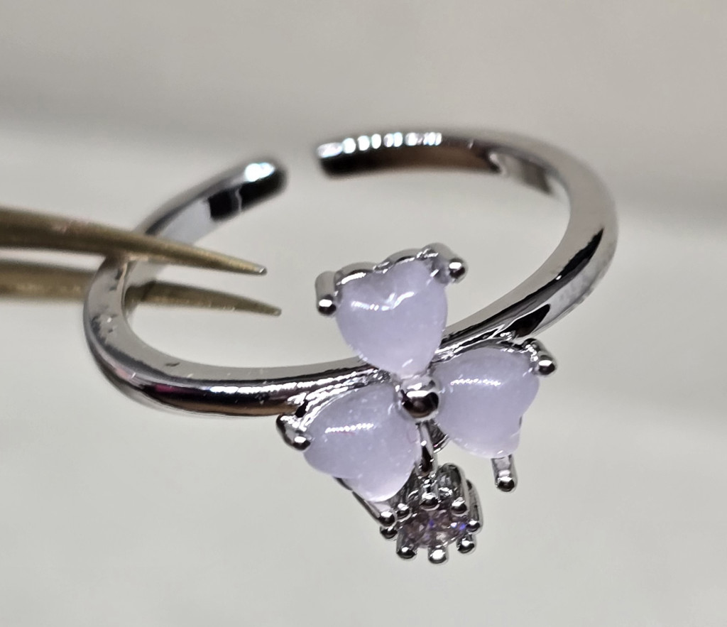 Tündérgyűrű ezüstszínű, 3 szirmú rózsaszín virágos-medállal