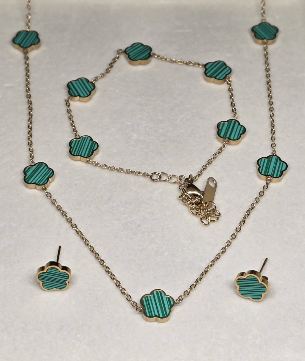Vintage 5 szirmú fülbevaló-nyaklánc-karkötő szett zöld