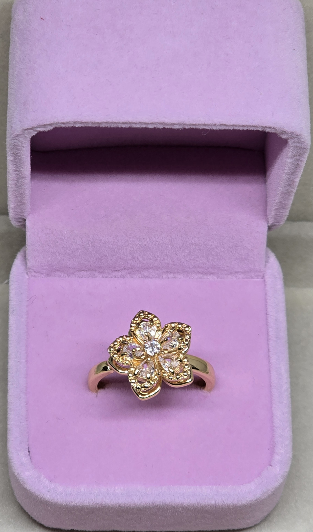 Aranyszínű forgóvirágos gyűrű, átlátszó köves