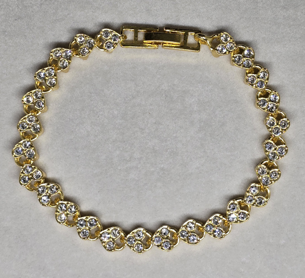 Aranyszínű apróköves karkötő, szív formájú elemekkel