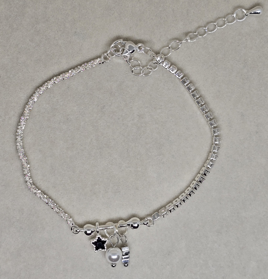 925-ös ezüst, csillagos-gyöngyös karlánc, fekete kővel