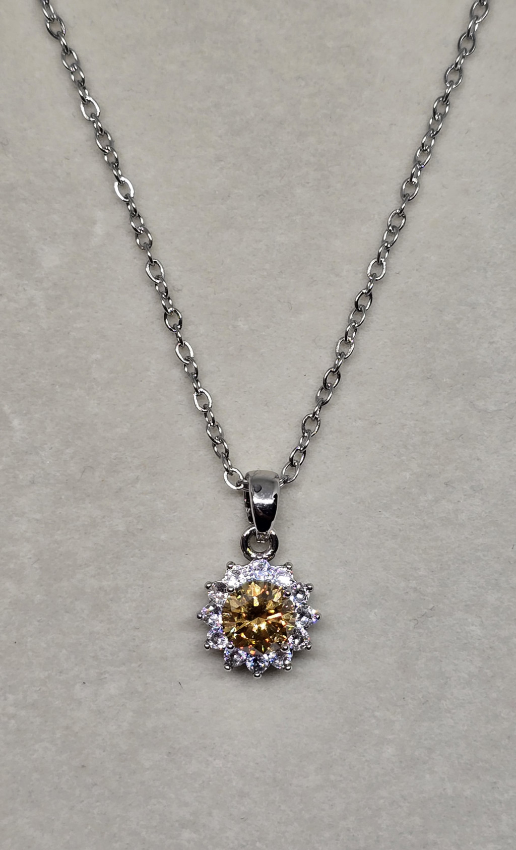 Ezüstszínű nyaklánc, virágmintás medállal, aranyszínű kővel