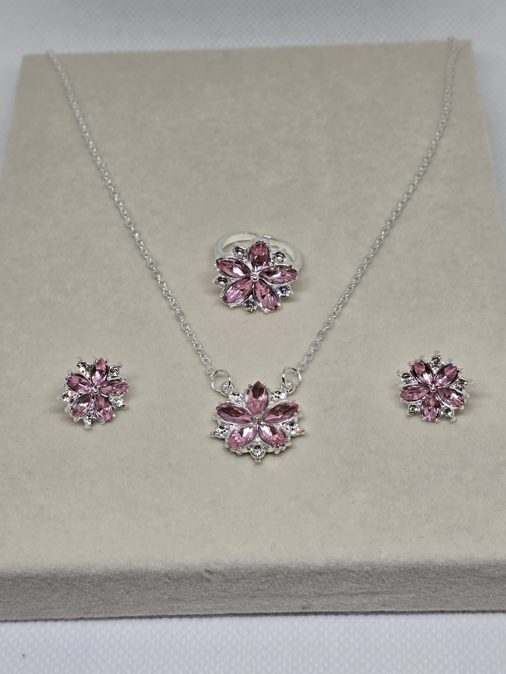 Ezüst, rózsaszín virágos fülbevaló-nyaklánc-állítható gyűrű szett