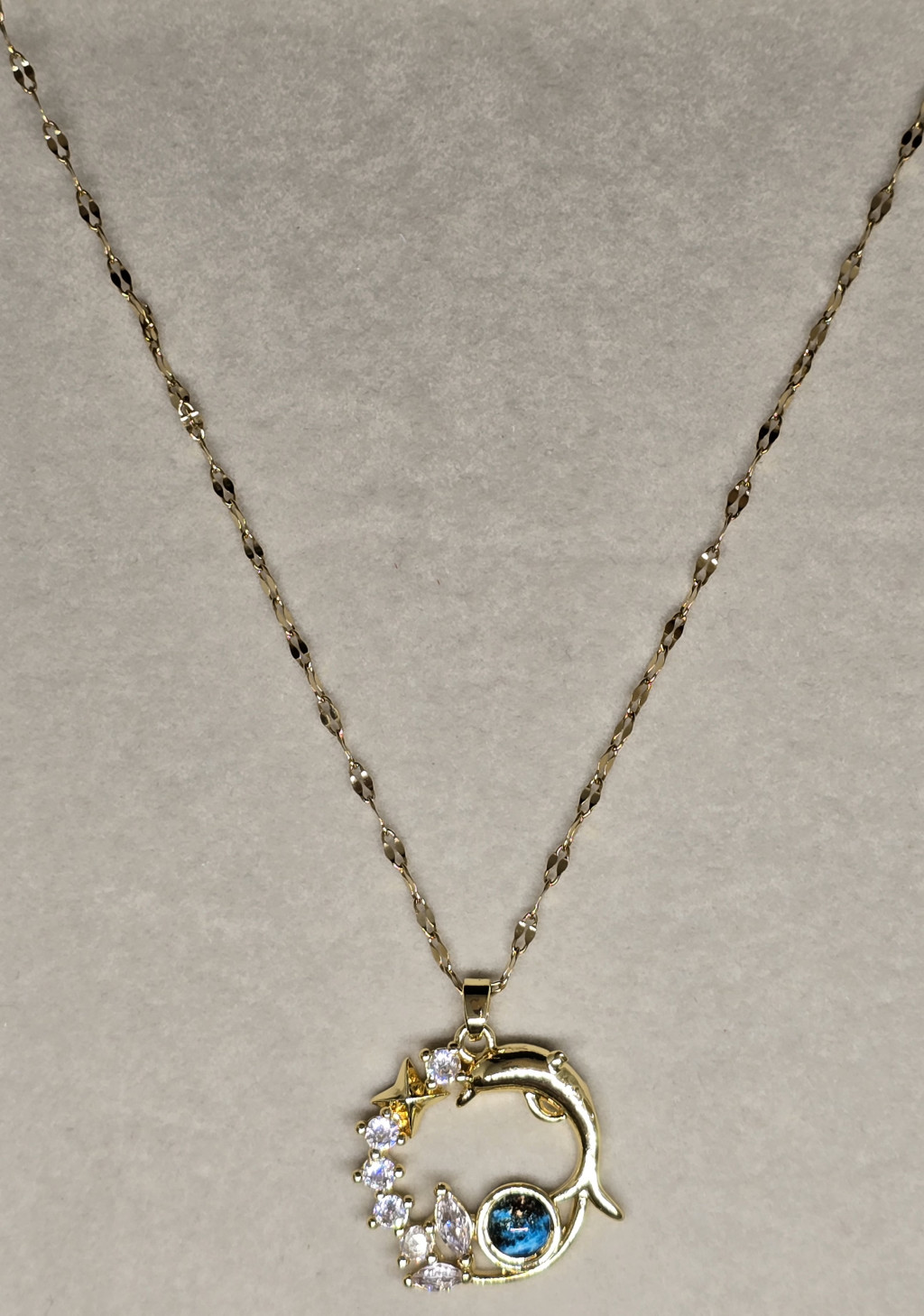 Nyaralási témájú, aranyszínű nyaklánc kerek delfines, égboltos medállal